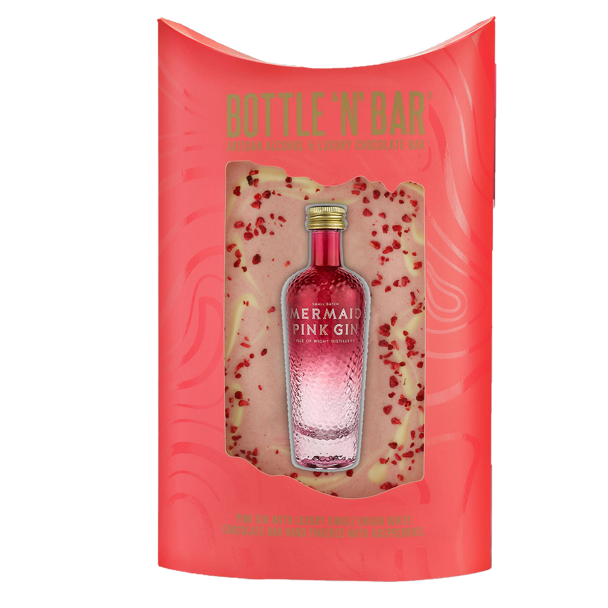 Mermaid Pink Gin is crafted on the Isle of Wight and is a wonderfully tasting pink gin. It also looks great, even in this smaller 5cl size the bottle is artistic and distinctive. To make it even sweeter we've surrounded the gin with a luxurious bar of while chocolate swirled with raspberry juice and sprinkled with raspberry pieces for that subtle sharpness that pairs beautifully with the smooth creaminess of the chocolate itself.